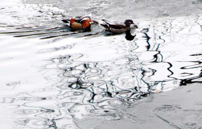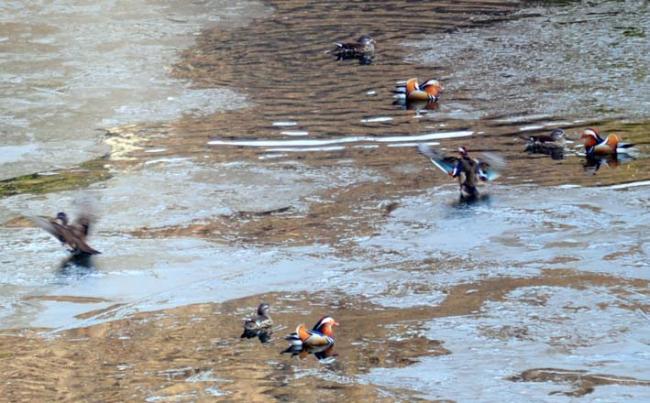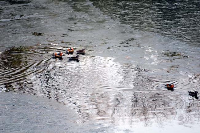 천진암 성지 빙천담에 찾아온 원앙새들이 반쯤 녹은 연못 물에서 물놀이를 시작 했다.(09.03.12)