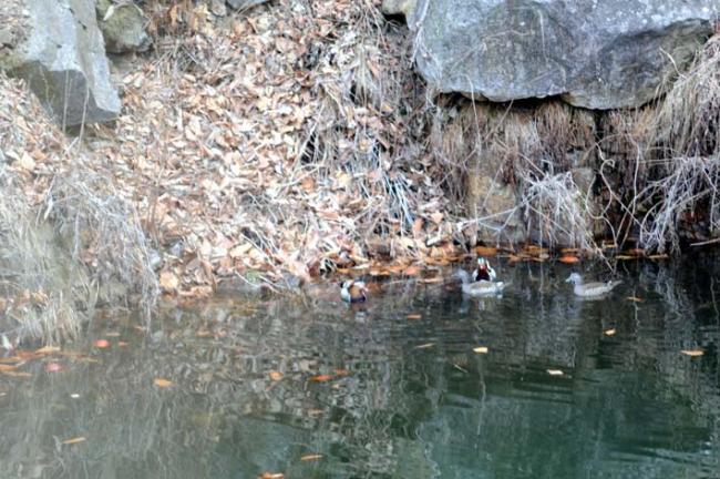 천진암 성지 빙천담에 어김없이 찾아온 원앙새들. 금년에는 새로지은 원앙새 아파트도 6채나 무상으로 분양중이다.(09.03.12)