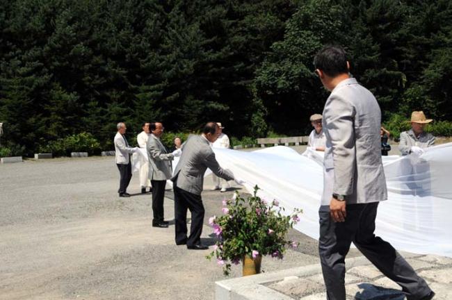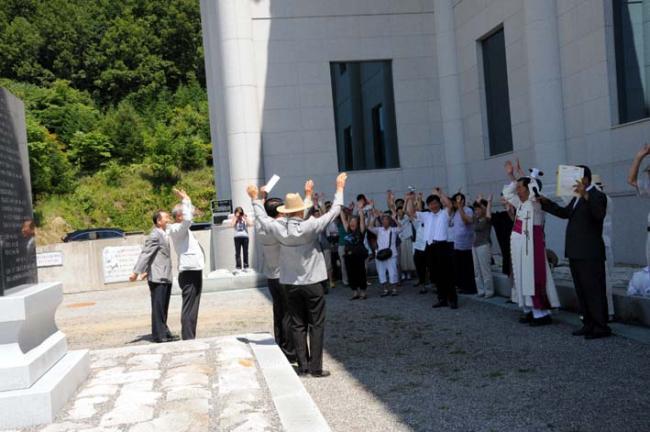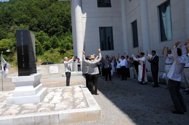 문도공 요한 정약용 승지 탄생 250주년 기념 詩文碑 제막, 축성(천진암박물관, 2012.08.05)후, 대한민국 만세3창(용인대리구청 대리구장 김학렬 신부)