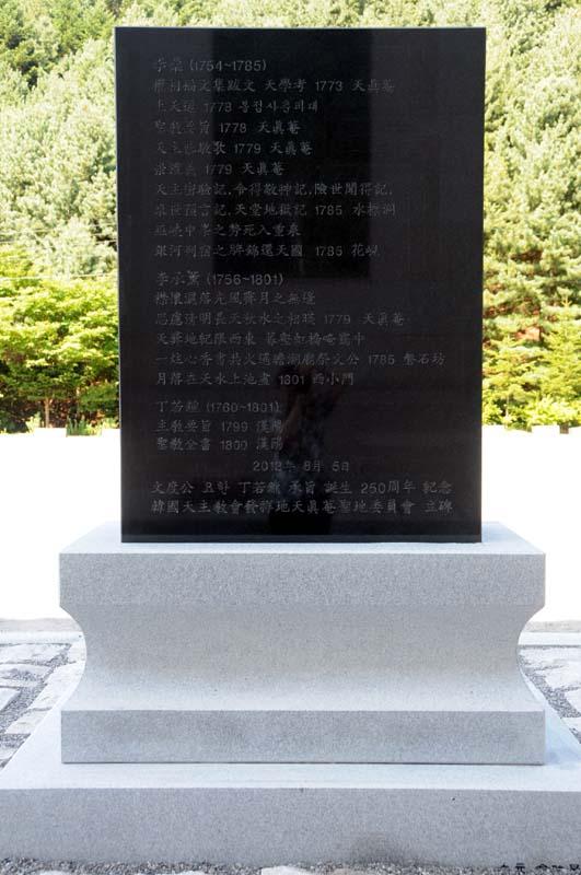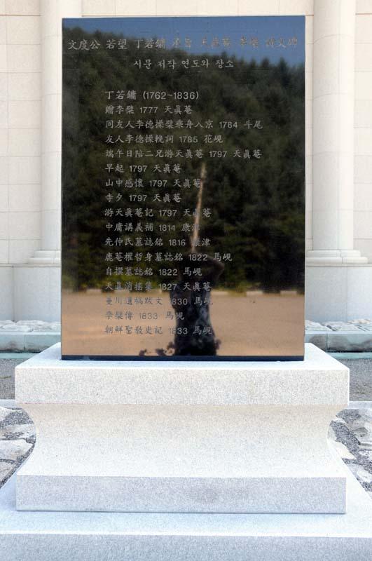 8월 5일 주일은 문도공 요한 정약용 승지(文度公 若望 丁若鏞 承旨) 탄생 250주년 기념일! 시비 내용 <전면> 文度公 요한 丁若鏞 承旨 誕生 250周年 紀念 詩文碑 시문 저작 연도와 장소 丁若鏞 (1762~1836) 贈李檗 1777年 天眞菴 同友人李德操檗乘舟入京 1784年 斗尾 友人李德操輓詞 1785年 花峴 端午日陪二兄游天眞菴 1797年 天眞菴 早起 1797年 天眞菴 山中感懷 1797年 天眞菴 寺夕 1797年 天眞菴 游天眞菴記 1797年 天眞菴 中庸講義補 1814年 康津 先仲氏墓誌銘 1816年 康津 鹿菴權哲身墓誌銘 1822年 馬峴 自撰墓誌銘 1822年 馬峴 天眞消搖集 1827年 天眞菴 蔓川遺稿跋文 1830年 馬峴 李檗傳 1833年 馬峴 朝鮮聖敎史記 1833年 馬峴 2012년 8월 5일 文度公 若望 丁若鏞 承旨 誕生 250周年 紀念 韓國天主敎會發祥地天眞菴聖地委員會 立碑 <後面> 李檗(1754~1785) 權相福文集跋文 天學考 1773年 天眞菴 上天道 1778年 봉점사춘파대 聖敎要旨 1778年 天眞菴 天主恭敬歌 1779年 天眞菴 崇禮義 1779年 天眞菴 天主密驗記 令得敬神記 險世聞得記, 來世預言記,天堂地獄記 1785年 水標洞 巫峽中峯之勢死入重泉 銀河列宿之年錦還天國 1785年 花峴 李承薰(1756~1801) 襟懷灑落光風霽月之無邊 思慮淸明長天秋水之相暎 1779年 磐石坊 天彛地紀限西東 暮壑虹橋唵靄中 一炷心香書共火 遙瞻潮廟祭文公 1785年 磐石坊 月落在天水上池盡 1801年 西小門 丁若鍾(1760~1801) 主敎要旨 1799年 漢陽 聖敎全書 1800年 漢陽 2012년 8월 5일 文度公 若望 丁若鏞 承旨 誕生 250周年 紀念 詩文碑 韓國天主敎會發祥地天眞菴聖地委員會 立碑 <右側面> 其學(天學)大抵異於孔孟之學 一七九一 刑曹 權日身(1742~1792) <左側面> 양근고을 갈산(葛山) 권쳘신이 령셰하니, 본명은 암보로시오-라 열심슈계함으로 치명의 아름다온 화관을 밧으니라 一九0六 寶鑑 대한셩교사긔 一券 五二面 權哲身(1736~1801)