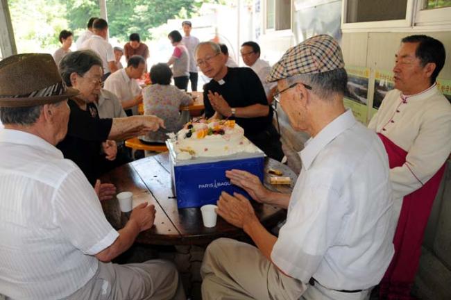 문도공 요한 정약용 승지 탄생 250주년 기념 詩文碑 제막, 축성(천진암박물관, 2012.08.05)후, 낮12시 주일 순롁객 기념미사(김학렬 신부님 주례)후, 콩국수와 수박으로 점심식사(이승훈성현 6대 후손 이병림 할머니의 케익절단)