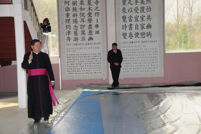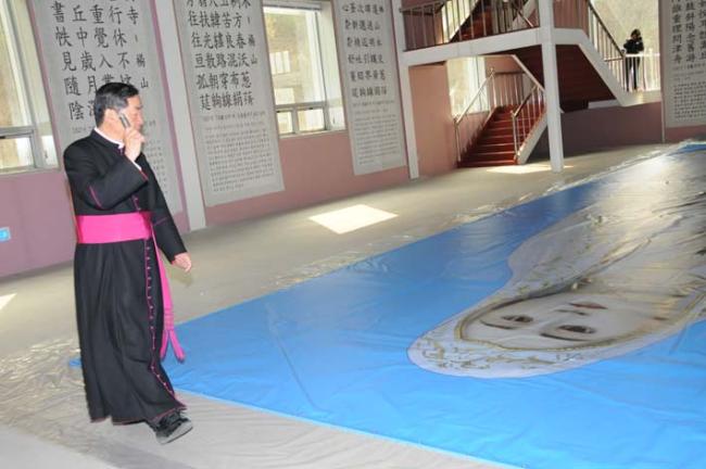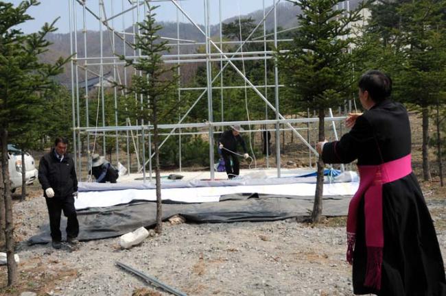 성모상 사진판 부착작업전에 박물관에서 성모상 축성(2012.04.16)