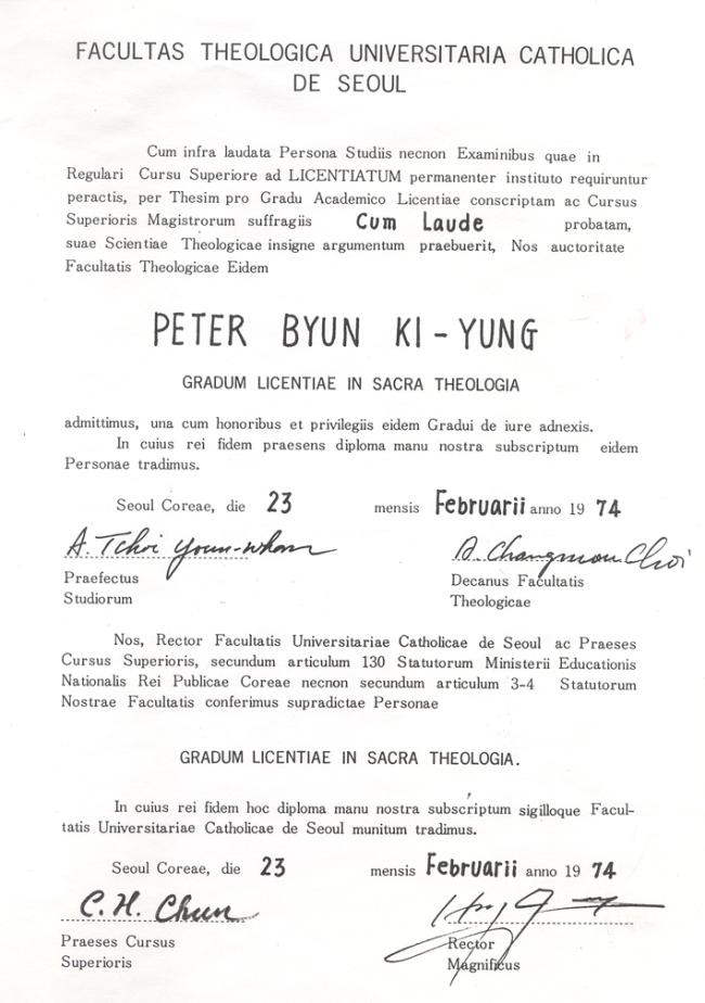 ● 1972~1974, GRADUM LICENTIAE IN SACRA THEOLOGIA in the Seoul Catholic University Graduate School.
