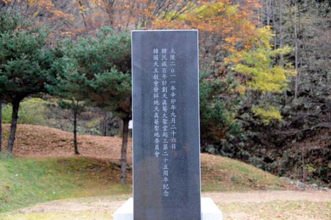 천진암 성지와 한국천주교회 창립성조들에 관한 복자 요한바오로 2세 교황의 공식선언문과 강론 원문 및 번역문이 조각된 기념 비석. (2011.11.05)