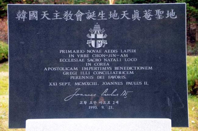 천진암 성지와 한국천주교회 창립성조들에 관한 복자 요한바오로 2세 교황의 공식선언문과 강론 원문 및 번역문이 조각된 기념 비석.