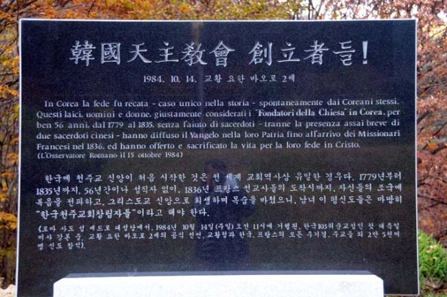 천진암 성지와 한국천주교회 창립성조들에 관한 복자 요한바오로 2세 교황의 공식선언문과 강론 원문 및 번역문이 조각된 기념 비석. (2011.11.01)