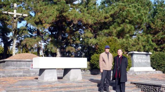 변기영 몬시뇰과 제주교구 동창신부인 이태수 신부가 제주도 모슬포 대정성지에 있는 정명연 마리아(순교자 황사영 알렉시오의 부인)묘 참배(08.12.12)