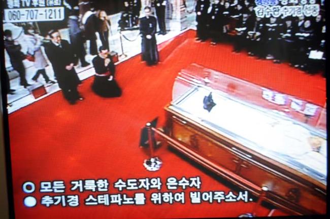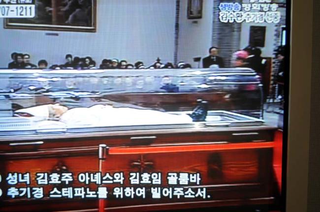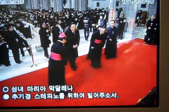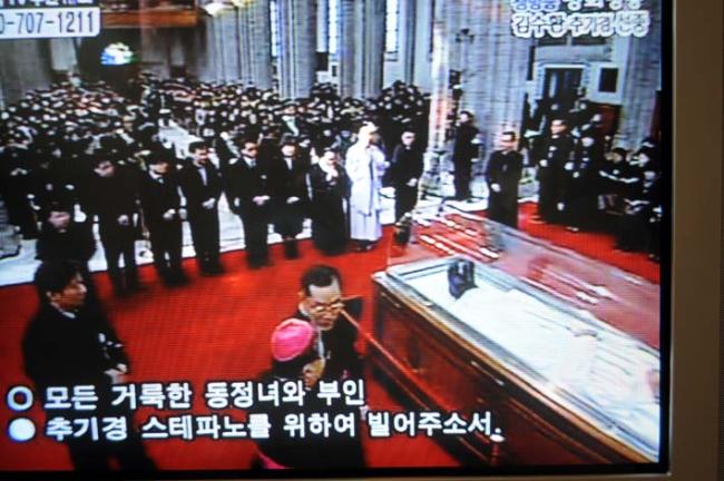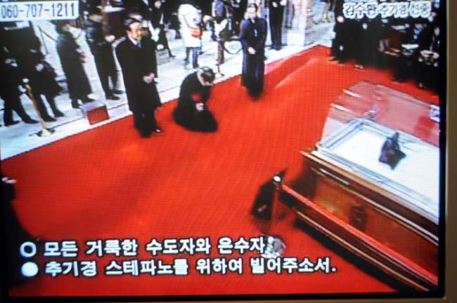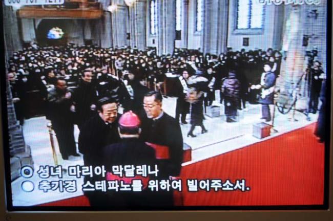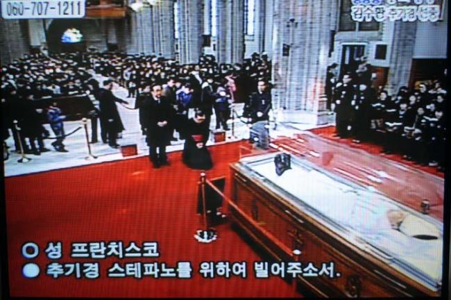 고 김수환 추기경님 조문(변기영 몬시뇰과 안강민 수석부위원장(한민족100년계획대성당건립위원회), 09.02.18(수), 명동대성당, T.V에서 촬영)