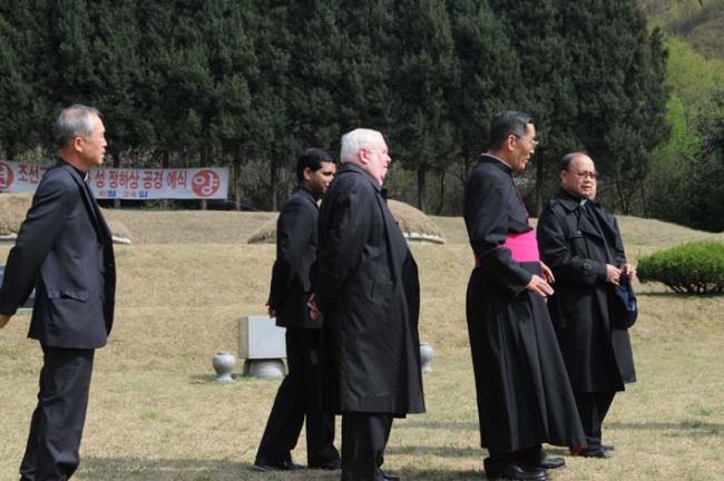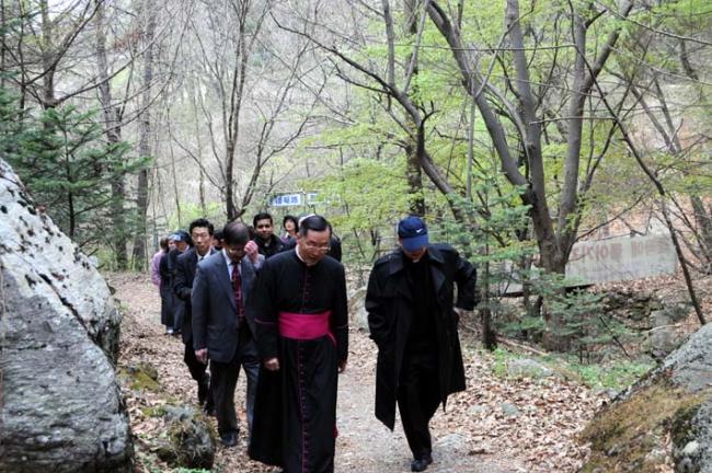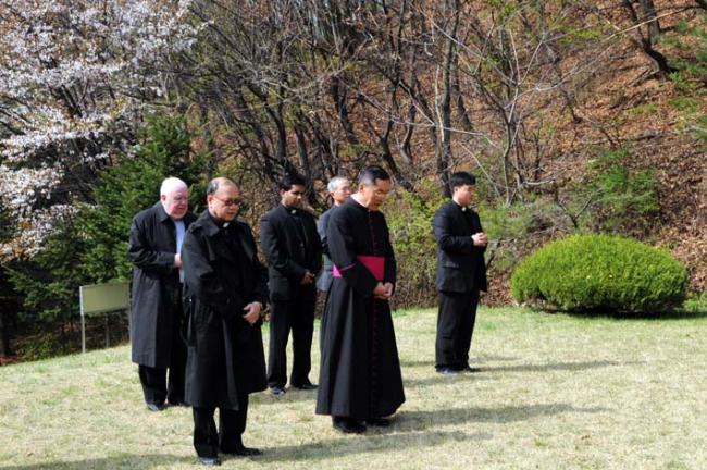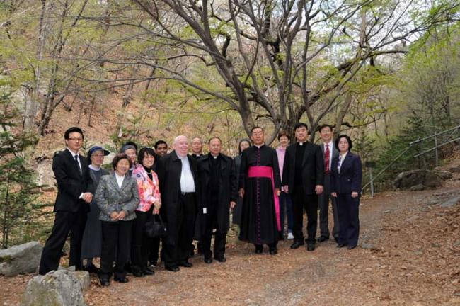 주한 교황대사 오스발도 파딜랴 대주교님, 참사관 비서 신부님, 함제랄도 신부님 외 대사관 전 직원 10명 성지 순례시 성모경당에서 12시 순례객 미사 봉헌(09.04.16. 금, 창립성현 묘 참배 하러 가는 장면 ).