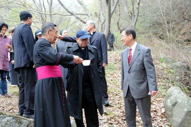 주한 교황대사 오스발도 파딜랴 대주교님, 참사관 비서 신부님, 함제랄도 신부님 외 대사관 전 직원 10명 성지 순례시 성모경당에서 12시 순례객 미사 봉헌(09.04.16. 금) 후에,천진암 터에 이르러 200여 년 전에 창립성현들이 마시던 빙천 수를 교황대사님과 변기영 몬시뇰이 마시오 있다.