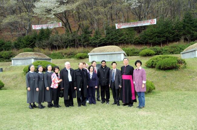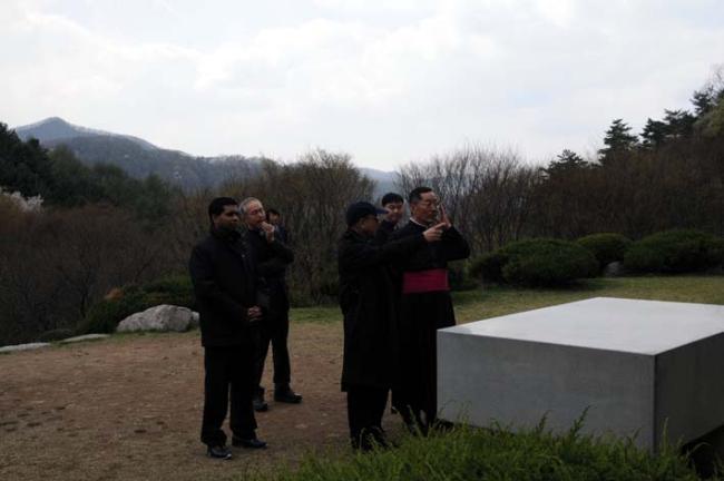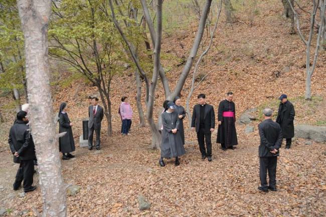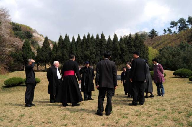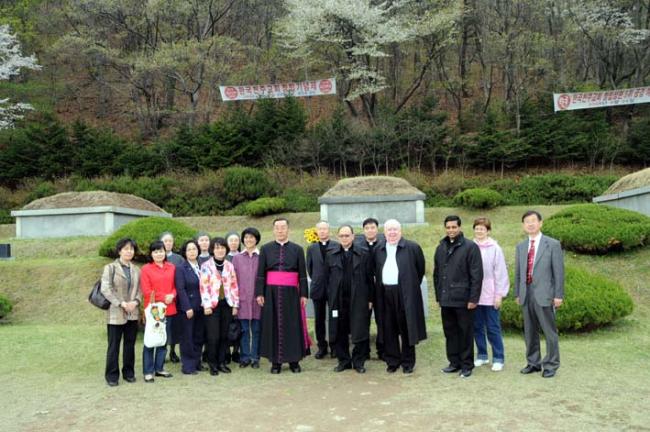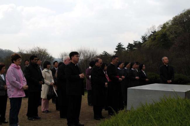 주한 교황대사 오스발도 파딜랴 대주교님, 참사관 비서 신부님,김학렬 신부님,이그레고리오 신부님, 팔로틴회 신부님, 함제랄도 신부님 외 대사관 전 직원 10명 성지 순례시 성모경당에서 12시 순례객 미사 봉헌(09.04.16. 금, 묘역가는 도중 200주년 기념비 앞).
