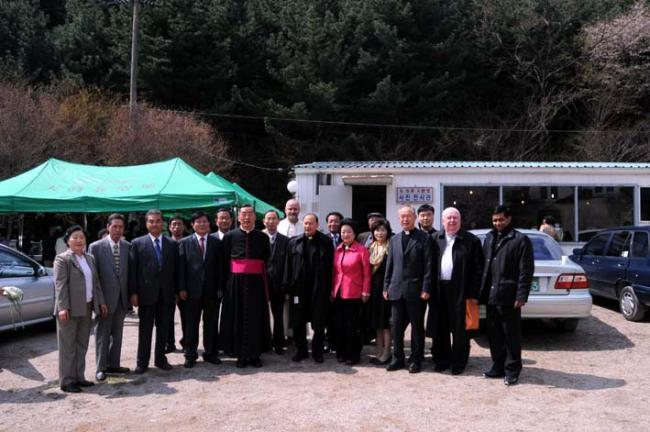 주한 교황대사 오스발도 파딜랴 대주교님, 참사관 비서 신부님, ㅣ김학렬 신부님,함제랄도 신부님 외 대사관 전 직원 10명 성지 순례시 성모경당에서 12시 순례객 미사 봉헌(09.04.16. 금, 창립성현들 참배 중).