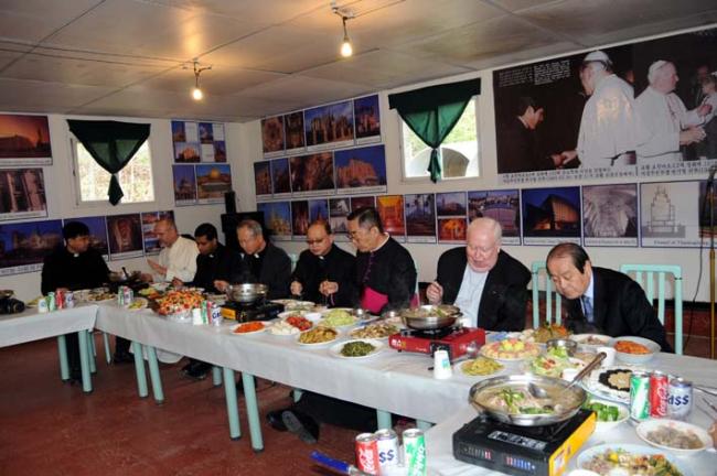 주한 교황대사 오스발도 파딜랴 대주교님, 참사관 비서 신부님, 함제랄도 신부님 외 대사관 전 직원 10명 성지 순례시 성모경당에서 12시 순례객 미사 봉헌(09.04.16. 금)후 식사하는 모습.