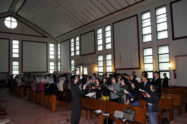 주한 교황대사 오스발도 파딜랴 대주교님, 참사관 비서 신부님, 함제랄도 신부님 외 대사관 전 직원 10명 성지 순례시 성모경당에서 12시 순례객 미사 봉헌(09.04.16. 금, 무지카 샤크라 합창단의 그레고리안 성가).