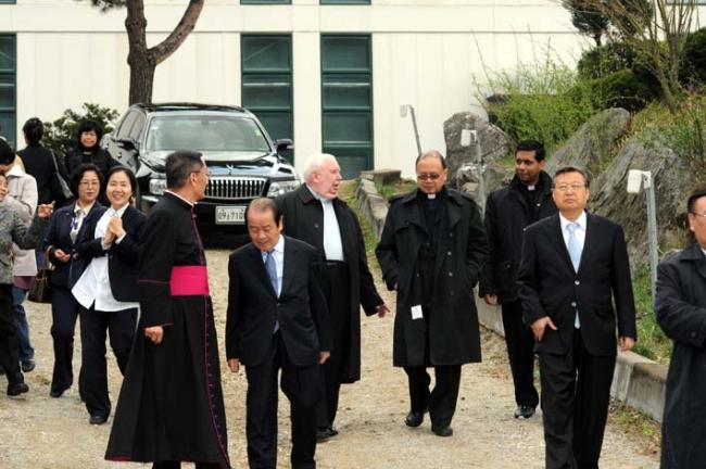 주한 교황대사 오스발도 파딜랴 대주교님, 참사관 비서 신부님, 함제랄도 신부님 외 대사관 전 직원 10명 성지 순례시 성모경당에서 12시 순례객 미사 봉헌(09.04.16. 금)을 마치고 식당으로 내려가는 모습.