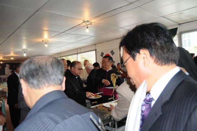 주한 교황대사 오스발도 파딜랴 대주교님, 참사관 비서 신부님, 함제랄도 신부님 외 대사관 전 직원 10명 성지 순례시 성모경당에서 12시 순례객 미사 봉헌(09.04.16. 금)후 식당에서 음식을 고르는 교황대사님과 변기영 몬시뇰.