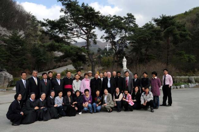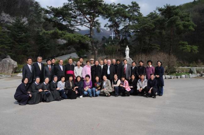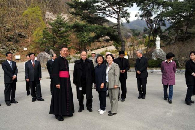 주한 교황대사 오스발도 파딜랴 대주교님, 참사관 비서 신부님, 함제랄도 신부님 외 대사관 전 직원 10명 성지 순례시 성모경당에서 12시 순례 미사 봉헌(09.04.16. 금,) 안내소 앞에서 성지 회장님들과 성지직원들과 함께.