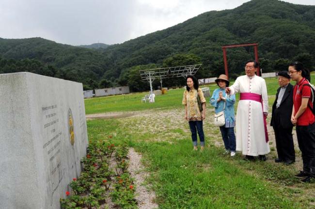 서울대교구 정의채 몬시뇰(대통령 자문위원) 외 3명, 천진암 성지 순례(2011.08.03), 천진암대성당 터에서 교황 요한 바오로 2세의 교황 강복문 설명.