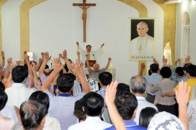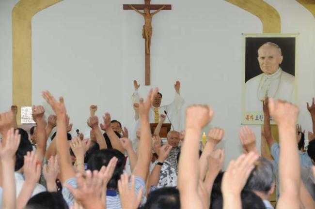 천진암 성지, 8월 15일 성모승천대축일, 낮 12시 순례객 미사후, 대한민국 만세, 한국천주교회 만세, 천진암 성지 만세, 성모 마리아 만세 3창을 각각 회장님들의 선창으로 하는 모습