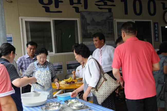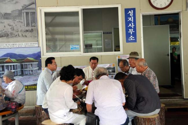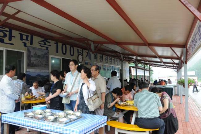 천진암 성지, 8월 15일 성모승천대축일, 낮 12시 순례객 미사후, 성지에서 점심식사로 준비한 콩국수, 찐고구마, 찐옥수수, 바나나, 아이스크림을 먹는 순례객들.