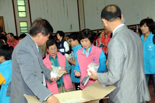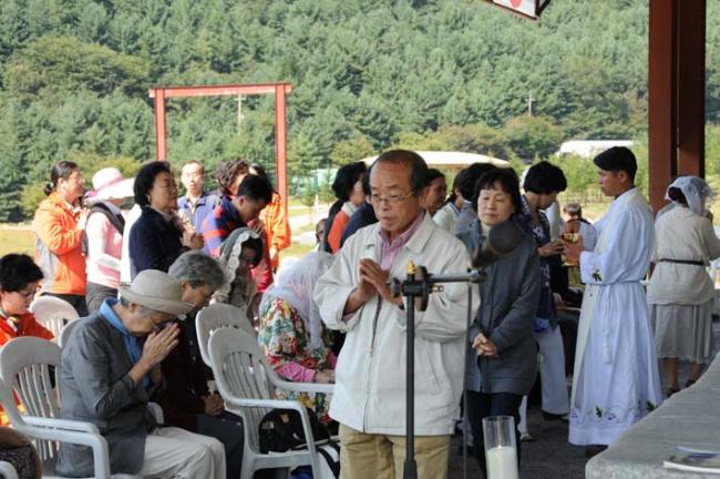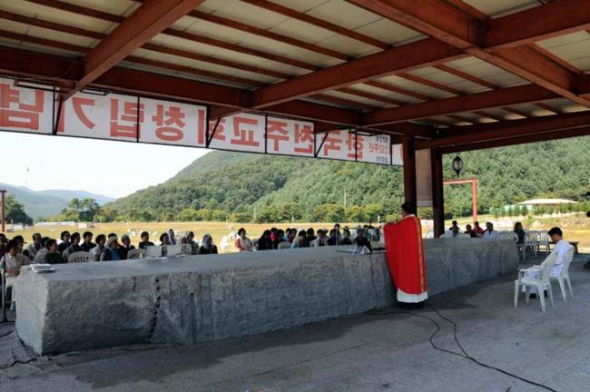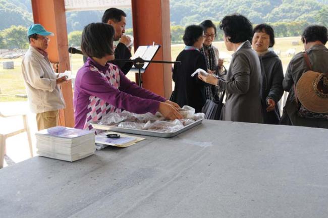 천진암 성지, 대성당건립 기공식 25주년 기념 순례객 12시 미사를 대성당 터 제단에서 봉헌후 찰시루떡을 나누어 주고 있다(이화여고 가톨릭 모임 33명 외)2011.09.26.월