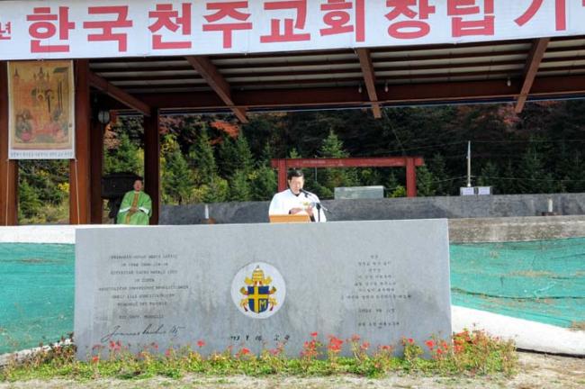 천진암성지, 대성당 터에서 주일 낮 12시 순례객 미사, 2011.10. 23.(이벽성조 후손 소개)