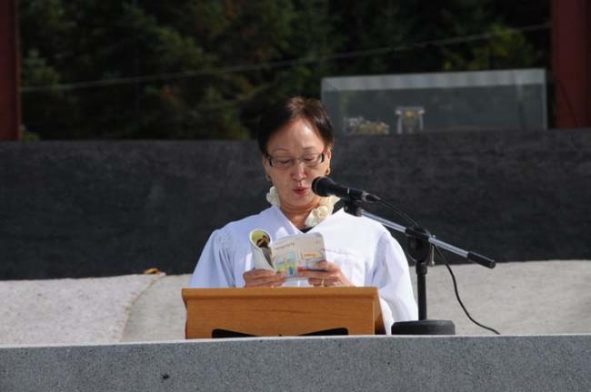 천진암성지, 대성당 터에서 주일 낮 12시 순례객 미사, 2011.10. 23.(미국 정진욱 박사 부부 참석, 제2독서하는 정헬레나 회장)