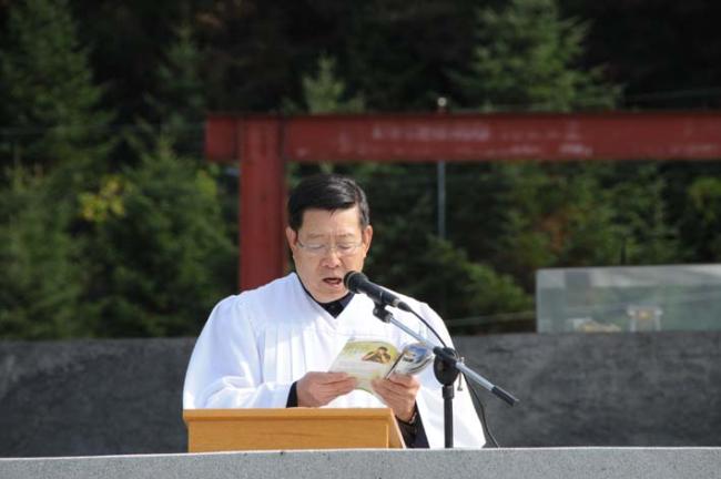 천진암성지, 대성당 터에서 주일 낮 12시 순례자 미사, 2011.10. 23.(미국 정진욱 박사 부부 참석, 제1독서하는 정진욱 박사)