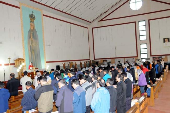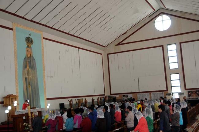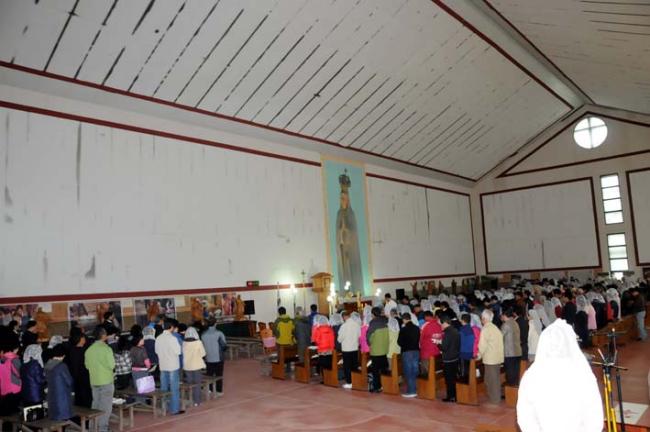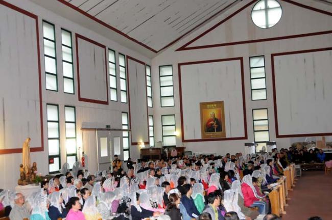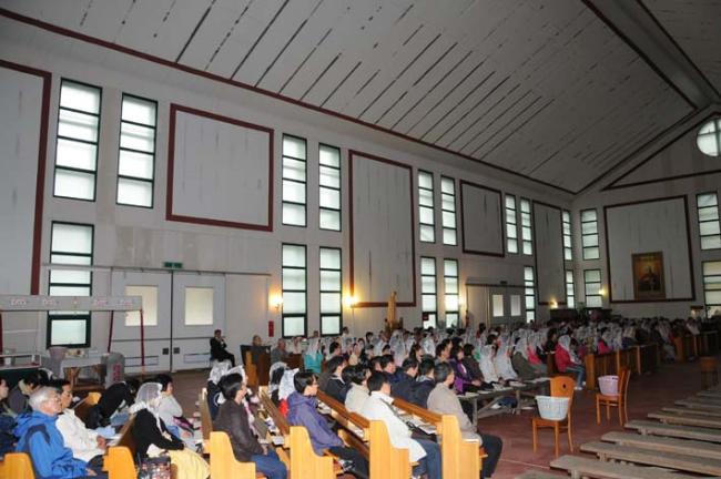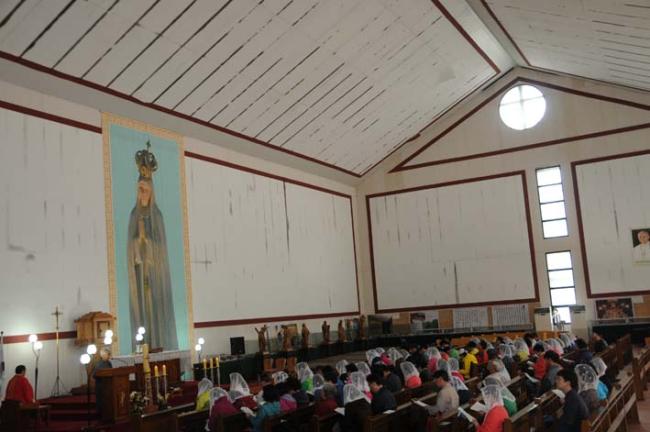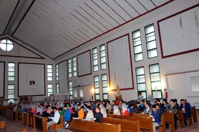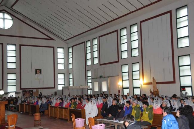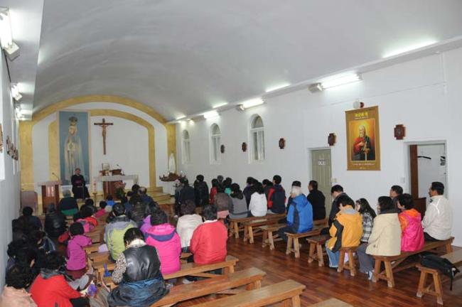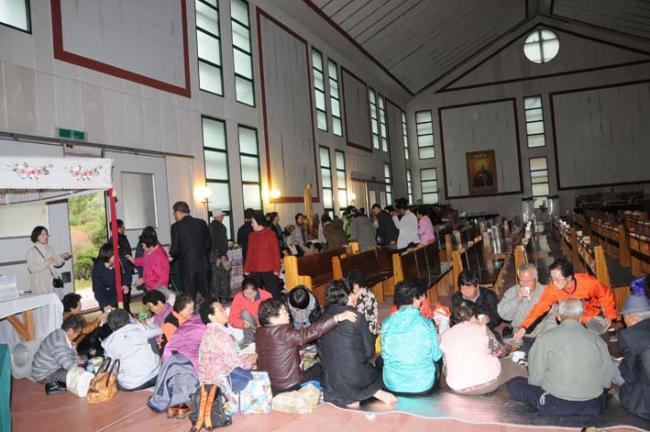 천진암 성지, 수원 기안성바오로 성당 130명, 수리동 성당45명 외, 12시 순례객 미사(2012.04.21)후, 우천으로 인하여 안동 화령동성당 신자들이 성모경당에서 점심식사