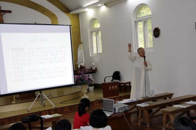수원교구, 용인대리구 청소년국 교리교사 양성교육반 45명 일일 피정 겸 천진암 성지 순례, 성지주임이신 김학렬 신부님이 천진암 성지에 관하여 스크린으로 설명(2012.09.01)