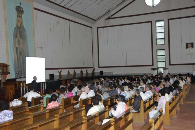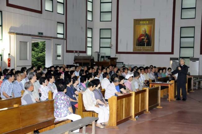 경주이씨 영주 화수회 250명 천진암 성지 순례(대부분이 미신자들 )후, 성지 주임이신 김학렬 신부가 성모경당에서 스크린으로 천진암 성지에 관하여 설명(2012.08.29)