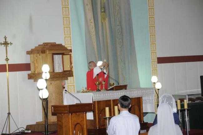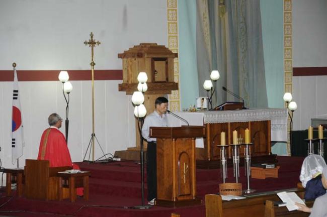 천진암 성지 주임 김학렬 신부님, 12시 순례객 미사 후 5위 성현 묘 참배, 의정부 교구 전곡성당 105명 외(2012.09.08, 토, 제1독서를 하는 전곡성당 회장)