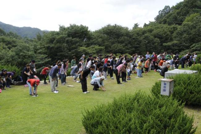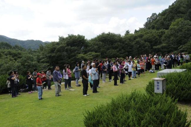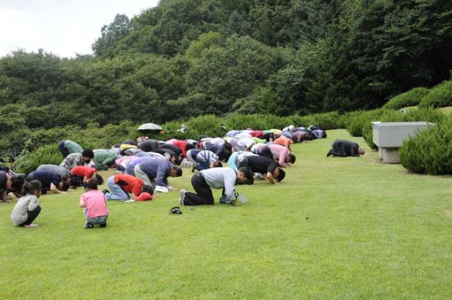 천진암 성지 주임 김학렬 신부님, 12시 순례객 미사 후 5위 성현 묘 참배, 의정부 교구 전곡성당 105명 외(2012.09.08, 토, 5위 창립성현들께 큰절을 하는 천진암 성지 주임 김학렬 신부님과 순례단들)