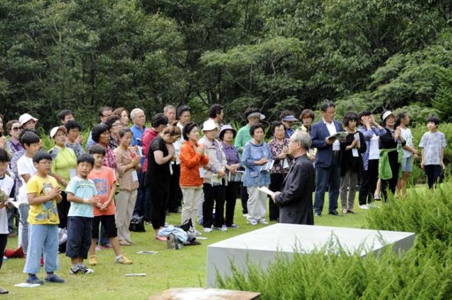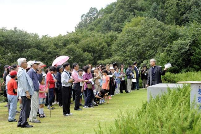 천진암 성지 주임 김학렬 신부님, 12시 순례객 미사 후 5위 성현 묘 참배, 의정부 교구 전곡성당 105명 외(2012.09.08, 토, 5위 창립성현 묘에서 기도)
