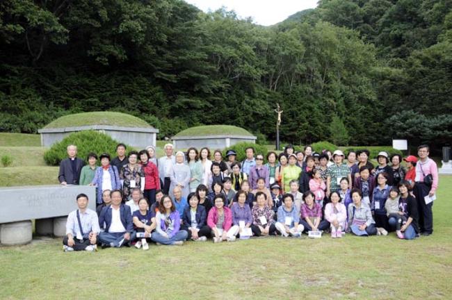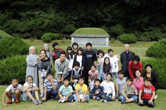 천진암 성지 주임 김학렬 신부님, 12시 순례객 미사 후 5위 성현 묘 참배, 의정부 교구 전곡성당 105명 외(2012.09.08, 토, 5위 창립성현들 묘앞에서 단체 기념사진, 학생부)