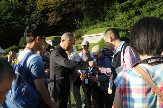 홍콩 신자 25명 성지 순례(도밍고회 Yuk Wa Christopher 신부)2012.09.24(성지순례 기념으로 신자들에게 성지 주임 김학렬 신부님이 향나무 묵주를 나누어 주고 있다)