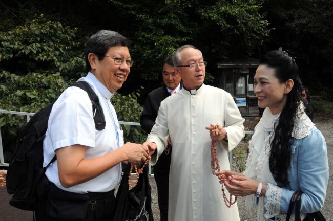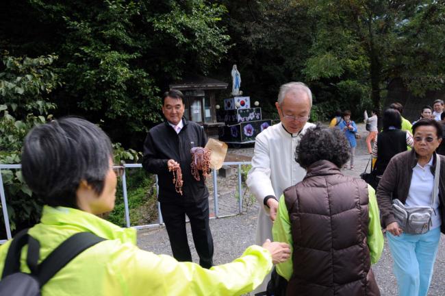 홍콩 天主敎 聖本篤堂(베네딕도 성당) LI CHI YUEN 신부와 신도 45명 천진암 성지 순례(2012.10.01)시, 성지 주임 김학렬 신부님이 성지순례 기념으로 향나무 묵주를 홍콩 신부와 신도들에게 나누어 주고 있다.