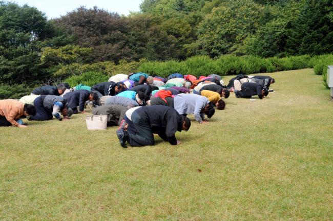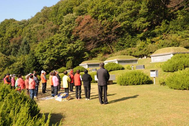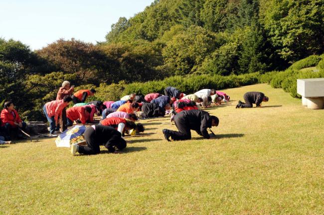 서울, 공항동 성당 평화 노인대학 68명 외, 천진암 성지 순례시, 한국천주교회 창립성현 5위 묘 참배후, 큰절을 하고 있다.(2012.10.12)