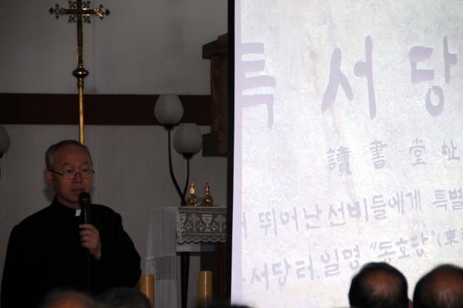 서울, 공항동 성당 평화 노인대학 68명 외, 천진암 성지, 12시 순례객 미사전에, 성지 주임 김학렬 신부님의 천진암 강학(2012.10.12)