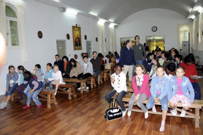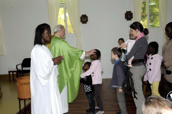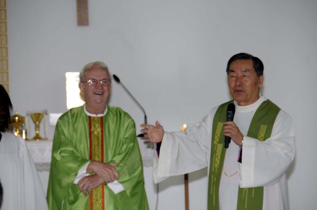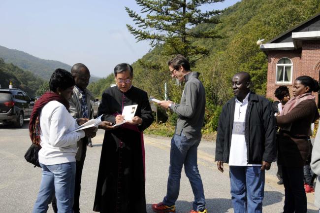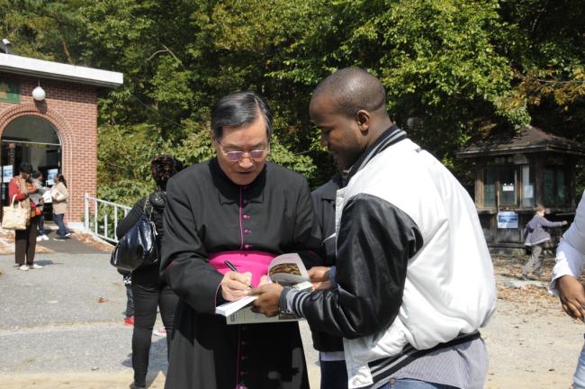 파리외방전교회 홍세안 신부 외 90여명, 천진암 성지 순례시 변기영 몬시뇰과 공동 주례, 미사(미사후 나누어 준 불어창립사에 변기영 몬시뇰에게 싸인을 받는 모습, 2012.10.14,주일)