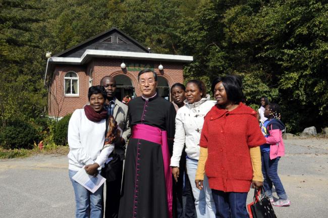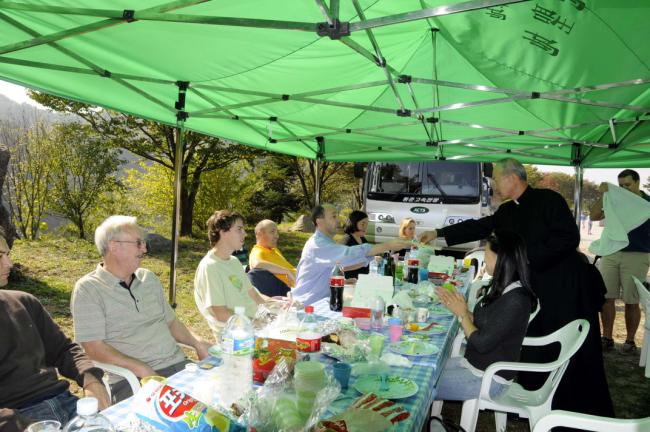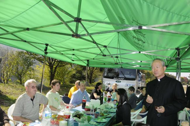 파리외방전교회 홍세안 신부 외 90여명, 천진암 성지 순례시 변기영 몬시뇰과 공동 주례,주일미사후, 점심식사(천진암 성지에서 치킨20마리와 찹쌀동동주로 대접,(2012.10.14,주일)