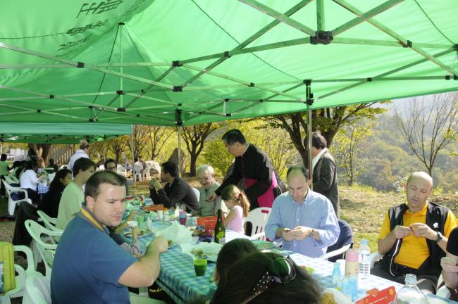 파리외방전교회 홍세안 신부 외 90여명, 천진암 성지 순례시 변기영 몬시뇰과 공동 주례, 주일미사후, 점심식사(천진암 성지에서 치킨20마리와 찹쌀동동주로 대접, 2012.10.14,주일)