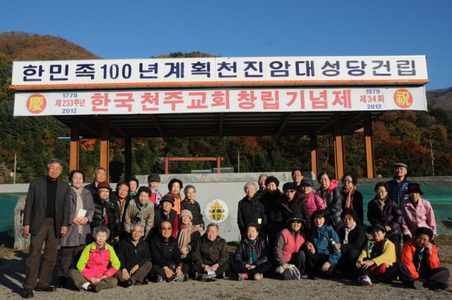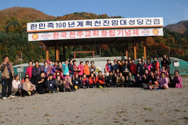 광주대교구, 평동성당(박옥규신부)66명, 천진암대성당 터 교황강복문 머릿돌 앞에서 단체기념사진(2012.10.31)