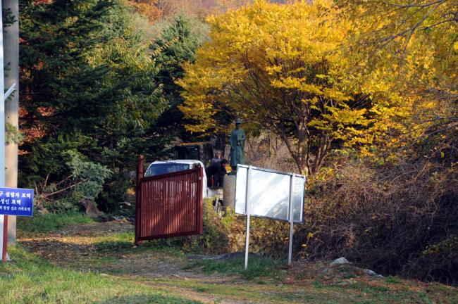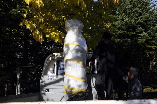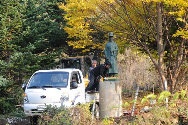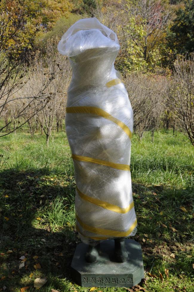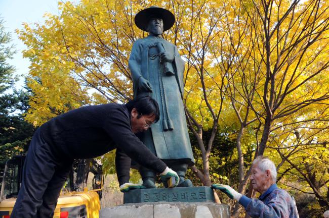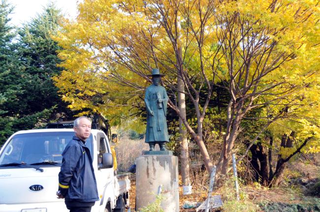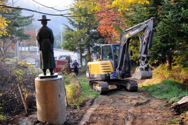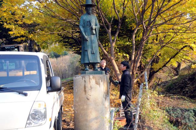 성 정하상 묘역 입구에 정하상 상 설치(받침대로 쓰일 노깡)