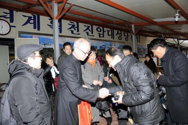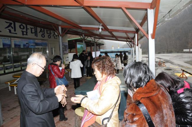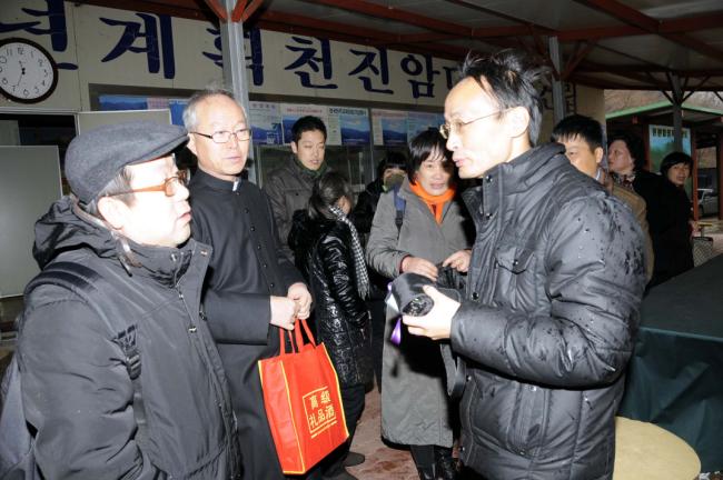 中國, 녕파교구 신포성당 44명(중국 방위평 신부, 길림교구 소속 조광택 신부), 천진암 성지순례(2012.11.28),성지주임 김학렬 신부, 선물로 향나무 묵주를 나누어 주고 있다.