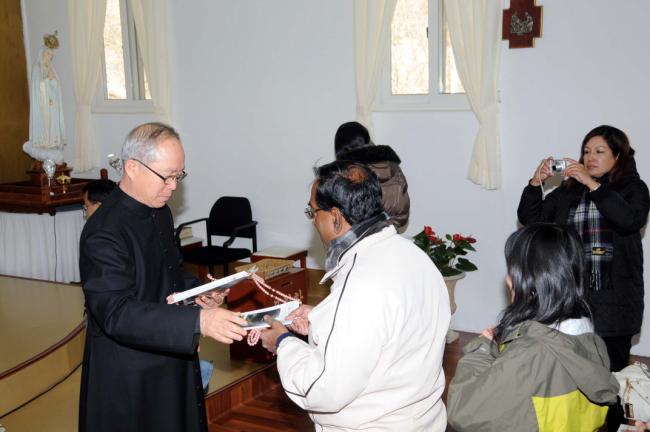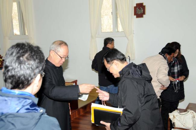말레이시아 신자(신부1명, Rev. Fr. Lim Clement Joshua)16명, 천진암 성지 순례(2012.12.04)(Church Immaculate Conception), 성지 주임 김학렬 신부님, 말레이시아 신자들에게 향나무 묵주와 성지 화보를 선물로 나누어 주고 있다.