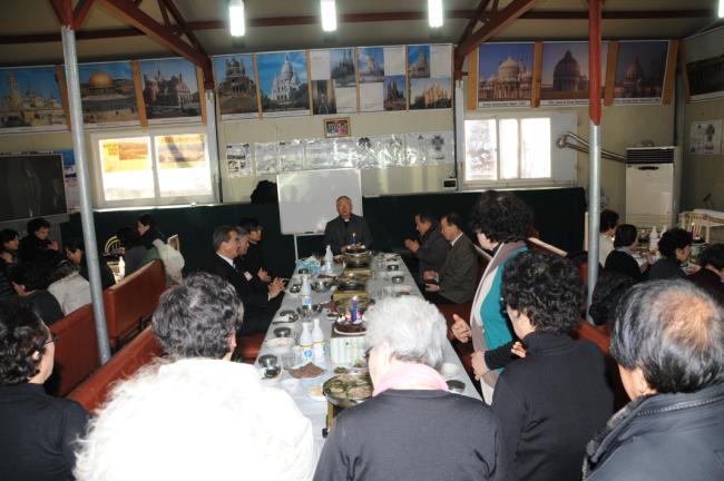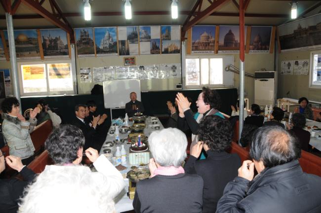 2012.12.27. 요한 사도 복음사가 축일 미사 및 능평성당 노인대학 난타공연(주임 김학렬 신부님 본명축일, 능평성당 노인대학팀의 난타공연과 하모니카 연주, 성지에서 제공해준 오리백숙으로 점심식사), 난타공연팀과 단체 기념사진