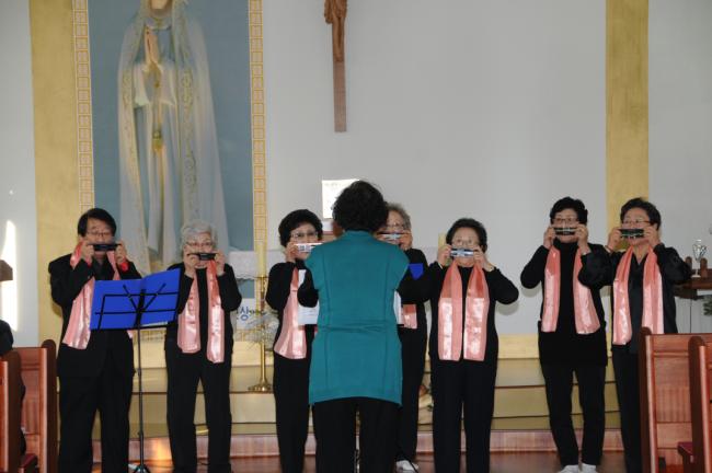 2012.12.27. 요한 사도 복음사가 축일 미사 및 능평성당 노인대학 난타공연(주임 김학렬 신부님 본명축일, 능평성당 노인대학팀의 난타공연과 하모니카 연주, 성지에서 제공해준 오리백숙으로 점심식사), 하모니카 연주팀과 단체기념사진