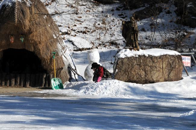 천진암 성지, 눈풍경(안내소 직원, 연젬마 자매의 눈사람 보수작업, 2013.01.01)