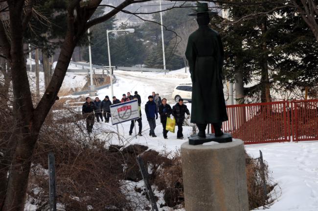 천진암 성지, 매년 첫번째로 순례오는 단체 순례객(서울, 암사동성당 나눔회 20명 외), 조선교구 설립자 정하상 성인 상을 거쳐 묘역으로 가는 모습